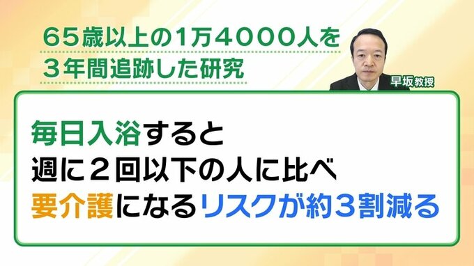 では、どれぐらいの頻度で入浴するといいのか?早坂教授によると、毎日入浴する人は、週に2回以下の人に比べ、要介護になるリスクが約3割減るということです。毎日お風呂に入ることによって、よく寝られて疲れが取れるサイクルができることが理由ではないかとみられています。