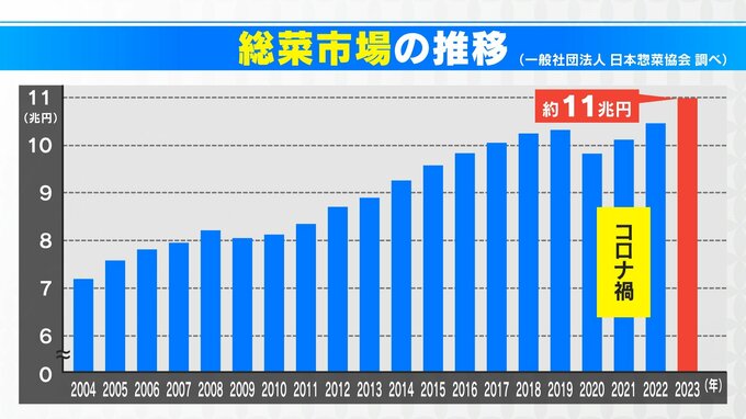 総菜市場は20年前は7兆円を超えるくらいだったのですが、順調に右肩上がりで伸びていきました。ただし、コロナ禍で少し厳しくなったんですね。