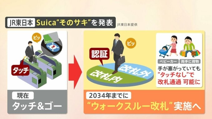 現在は改札にSuicaをタッチをして入る仕組みですが、2034年までに“タッチなし”で改札通過が可能になる“ウォークスルー改札”を実施していくということです。