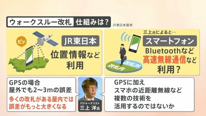 ITジャーナリスト三上洋氏は、「GPSの場合、屋外でも2~3メートルの誤差が出る。多くの改札がある屋内では誤差がもっと大きくなる」と話します。