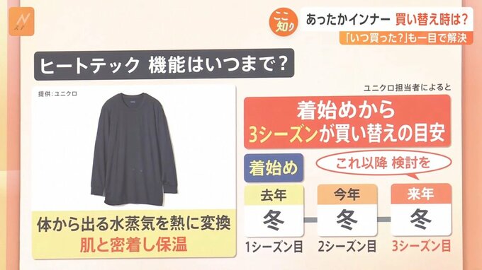 ユニクロ担当者によると、着き始めから3シーズンが買い替えの目安になるそうです。去年の冬に着始めた人は今年が2シーズン目、来年3シーズン目になりますので、来年以降に買い替えを検討してみても良いということです。