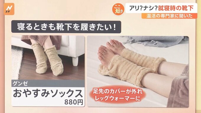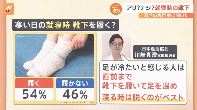 日本温活協会の川﨑真澄本部指導員によると、「足が冷たいと感じる人は直前まで靴下を履いて足を温め、寝る時は脱ぐのがベスト」だということです。