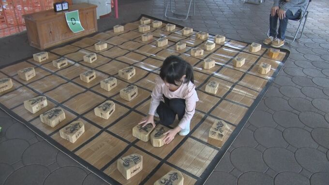 14回目を迎えた大会には9組の親子が出場し総当たり戦で勝負に挑みました。使用されるのは縦横3メートル畳2枚ほどもある大きな将棋盤。この盤の上でまるで下駄の様な大きな木製の駒を動かして試合を進めます。