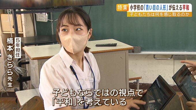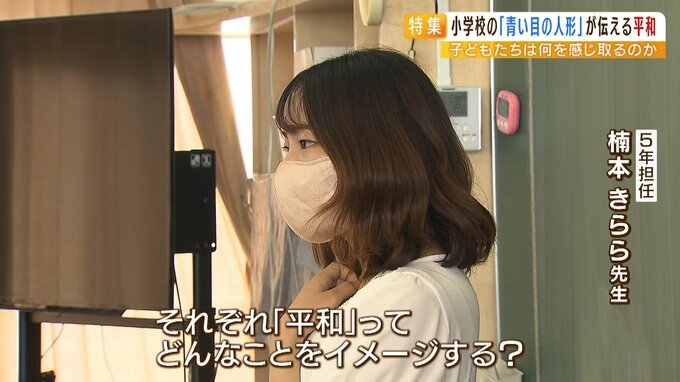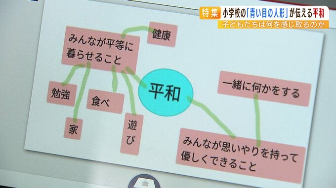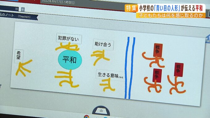 戦争を生き抜いた『青い目の人形』の物語 "友情の証し"が開戦後は"スパイ人形"に...今こそ小学校で「子どもたちに人形がある意味を知ってほしい」 毎日放送 2022年9月23日(金) 15:00 国内 暮らし・マネー 子どもたちが思い思いに『平和』を考える 授業は2回に分けて行うことに。1回目は子どもたちが思う平和について考える時間。 (児童らに話す5年担任の楠本きらら先生) 「それぞれ『平和』ってどんなことをイメージするかな?『平和って何?』のマッピングをしていきます」 タブレットを使い、思い思いに「平和」から連想する言葉を繋ぎ合わせていきます。平和だからこそできることを書いた子どもや…。 イラストを使って表現した子どもも。戦争から追いやられる平和の先には希望が待ち構えています。 (5年担任 楠本きらら先生) 「子どもならではの視点で平和を考えている。気持ちを考えたり、自分の身近な人を想像して考えたりしている子もいて、本当におもしろいというかいろいろな考えがあるんだなと改めて感じました」