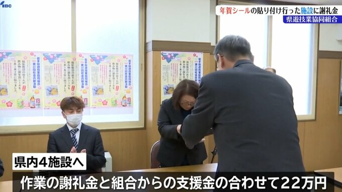 岩手県内のパチンコ店でつくる団体が、正月の利用客に配る飲み物に年賀のシールの貼り付けを行った社会福祉施設に謝礼金と支援金を贈りました。