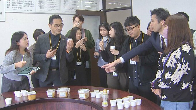 中でも西日本一となる年間15000トンを生産していることが紹介されると高い関心が寄せられました。このあと麦みそやフリーズドライなどでつくった5種類のみそ汁を試食し味の違いを確かめていました。
