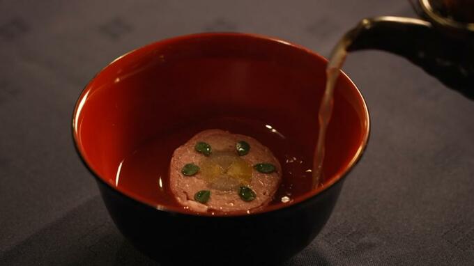 島ニンジンとゴボウを山羊肉で巻いたものに、繊細なコンソメスープを注いだ一品。ほのかにヤギの香りが漂います。