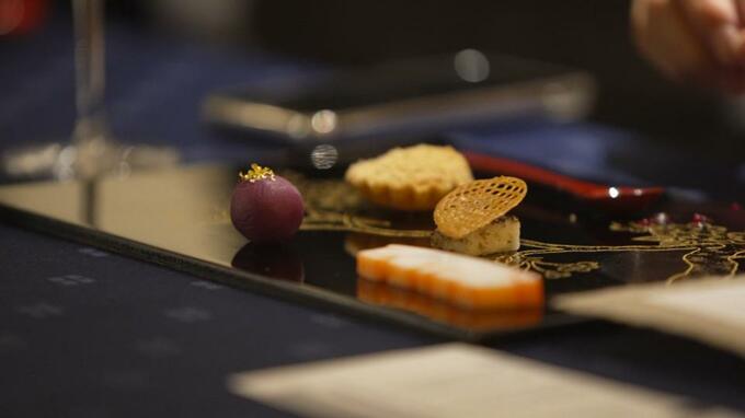 琉球の宮廷文化にモダンな解釈を加えた創作料理。世界トップクラスのシェフ・福山剛氏監修のもと、琉球料理伝承人の資格をもつ前川シェフが、沖縄食材の新たな活かし方を追究しました。料理ごとに合わせた飲み物も、参加者の好奇心を刺激します。