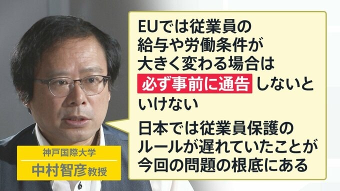 M&Aは世界中で行われていますが、神戸国際大学の中村智彦教授によると「EUでは従業員の給与や労働条件が大きく変わる場合は、必ず事前に通告しないといけない。また日本では、従業員保護のルールが遅れていたことが今回の問題の根底にある」と指摘しています。