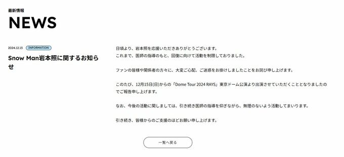13日、公式ホームページが更新され「日頃より、岩本照を応援いただきありがとうございます。これまで、医師の指導のもと、回復に向けて活動を制限しておりました。ファンの皆様や関係者の方々に、大変ご心配、ご迷惑をお掛けしましたことをお詫び申し上げます」とした上で「このたび、12月15日(日)からの『Dome Tour 2024 RAYS』東京ドーム公演より出演させていただくこととなりましたのでご報告申し上げます」と、15日からライブ活動を再開すると発表しました。