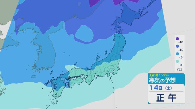 さらにより地上に近い上空およそ1500メートルの寒気の予想ですが、14日は石川県など北陸では-6度前後になりそうです。