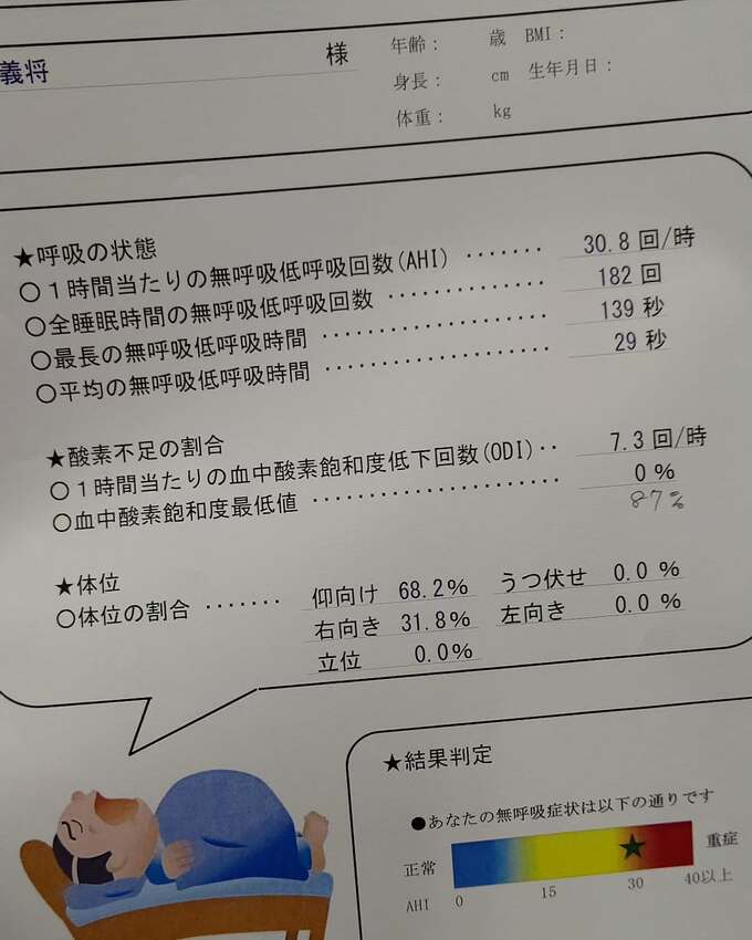 よしまささんは自身のインスタグラムで「呼吸の状態」や「酸素不足の割合」などが記された検査結果の画像を投稿。「結果判定」の欄には 正常よりも、やや重症の位置に星印のマークがついています。