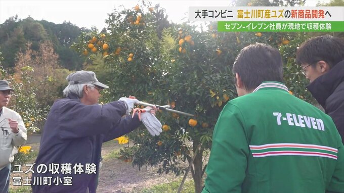 大手コンビニのセブン-イレブンが、山梨県富士川町特産のユズを使った新製品を開発することになり、13日は社員がユズの収穫を体験しました。