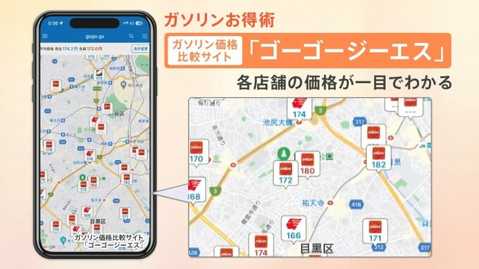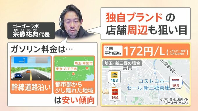 「ゴーゴージーエス」を運営するゴーゴーラボの宗像祐典代表によると、ガソリン料金は、▼幹線道路沿い、▼都市部から少し離れた地域は安い傾向にあるということです。