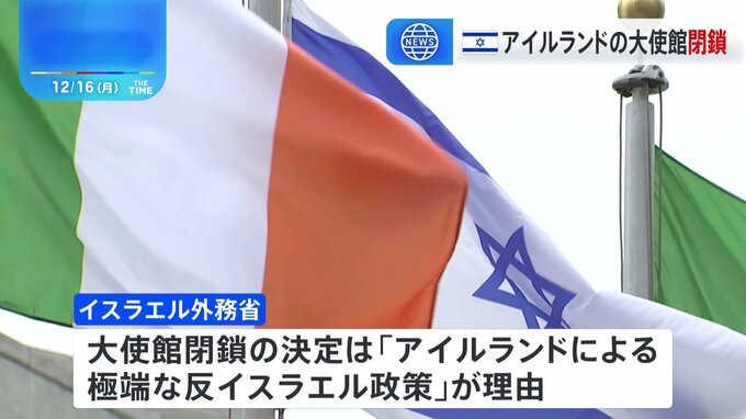 イスラエル政府はアイルランドが「極端な反イスラエル政策」を行ったとして、ダブリンにある大使館を閉鎖すると発表しました。イスラエル外務省は15日、サール外相がアイルランドの首都ダブリンにあるイスラエル大…