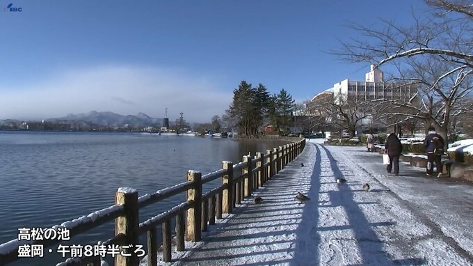 一方、盛岡市の高松の池では15日までに降った雪で歩道の一部が凍結していて、足元に注意しながら散歩する人もいました。