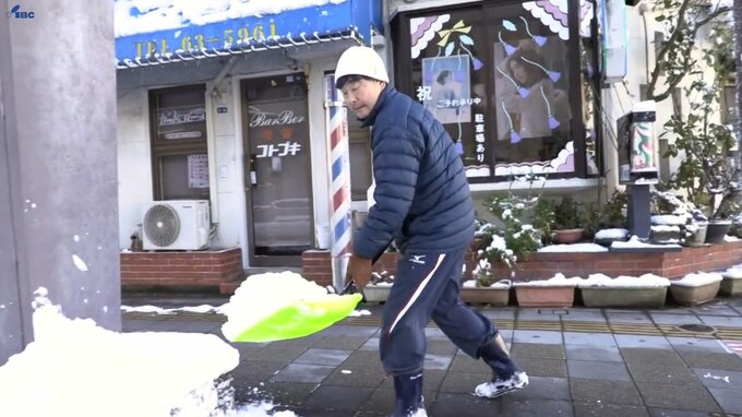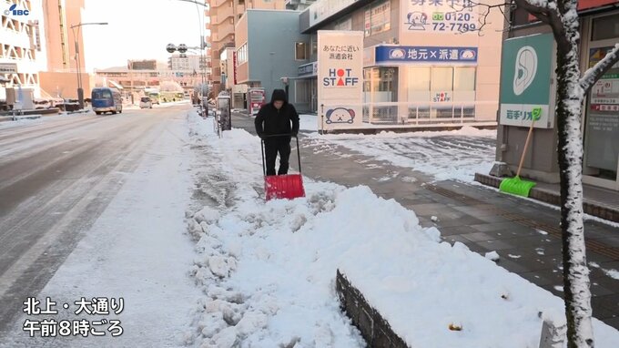 15日から10センチの降雪があった北上市の大通りでは、歩道や駐車場の除雪や車に積もった雪を払う人の姿がありました。