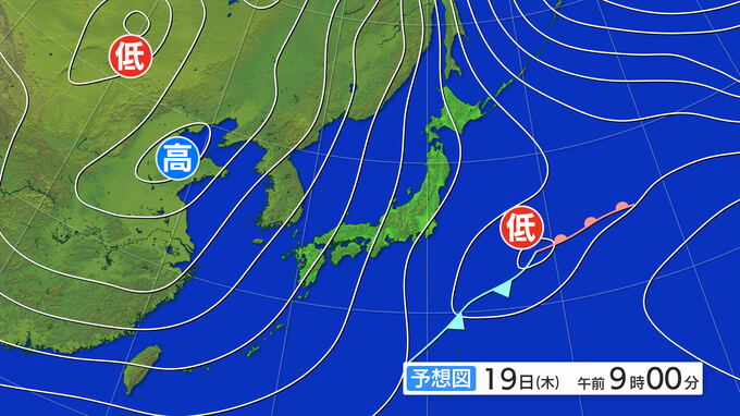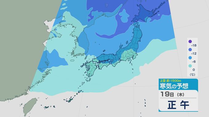 19日の上空およそ1500メートルの寒気の予想ですが、日中は中国地方や近畿、北陸などで-6度以下になる見込みです。