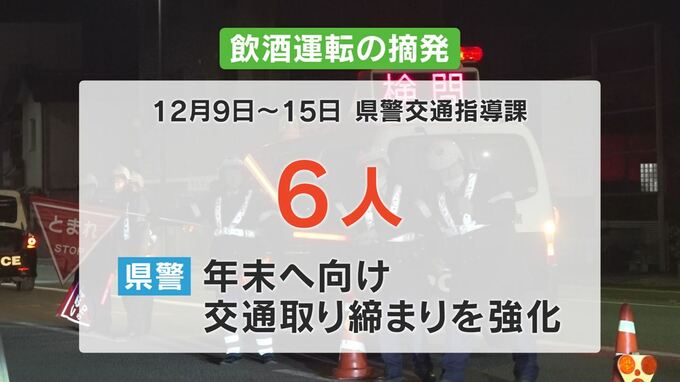 飲酒運転 1週間で6人を摘発 山梨県警 テレビ山梨 2024年12月16日(月) 19:21 国内 山梨県警は15日までの1週間で6人を飲酒運転で摘発しました。 県警交通指導課によりますと今月9日からの1週間に飲酒運転により6人を摘発しました。 今月は忘年会などで酒を飲む機会が増えることから県警は取り締まりを強化しています。