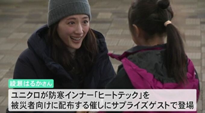 綾瀬さんは衣料ブランドのユニクロが防寒インナー「ヒートテック」を被災者向けに配布する催しにサプライズゲストとして招かれました。綾瀬さんは自ら、訪れた子どもたちにヒートテックを手渡すとともに市民との記念撮影にも笑顔で応じていました。