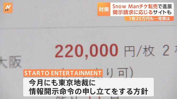 事態を重く見た、SnowManが所属するスタートエンターテイメント社は9日、ホームページで高額転売目的の出品者に不正転売行為に対する責任追及を行う方針で検討、転売サイト側に情報開示請求をした事を明らかにしました。