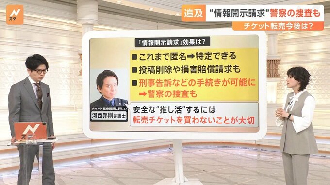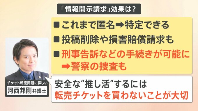 チケット転売問題に詳しい河西邦剛弁護士によると、重要なことは「安全な“推し活”をするには転売チケットを買わないことが大切」ということです。しかし、事務所として毅然とした対応を見せるのがこの「情報開示請求」ということになるわけです。