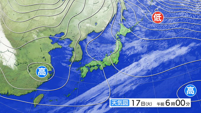17日(火)は、日本列島やその周辺は冬型の気圧配置が強まり上空に強い寒気が流れ込む見込みです。北陸地方では18日(水)にかけて大気の状態が非常に不安定になり、大雨になるところもありそうです。