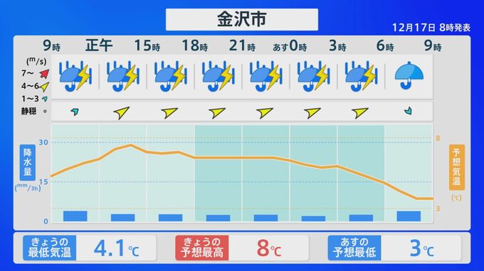 17日は北陸の上空に「強い寒気」で大気の状態が非常に不安定に 大雨による土砂災害などに注意・警戒を 雨と風シミュレーション 北陸放送 2024年12月17日(火) 10:26 国内 17日の石川県は断続的に雨が降り、強く降るところもあるでしょう。 山沿いや山間部では雪が降る見込みです。19日(木)は平地でも雪がふるでしょう。 北陸地方では、18日にかけて土砂災害に注意・警戒し落雷や竜巻などの激しい突風に注意してください。