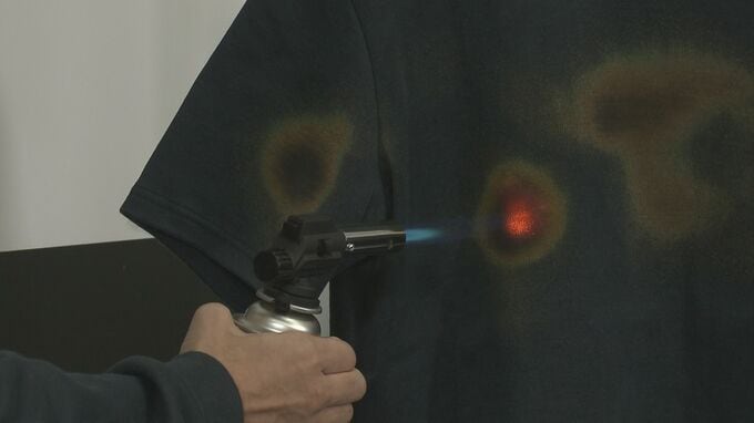 バーナーの火でも燃えない衣類を前に「変色はするけど、燃えることは無いんですよ」と説明する西村さん。