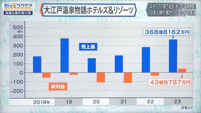 大江戸温泉グループが単年度黒字を実現したという決算。コロナ前の2018年、2019年は買収やリニューアルにかける費用が大きかったため、赤字となっていた。そしてコロナの時期も厳しい状況が続いていたが、ようやく2023年度、黒字に転換し、売上高もコロナ前の水準にまで戻った。