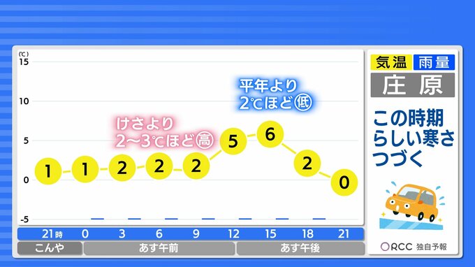 きょう17日(火)の広島県内は、寒気の影響が残り寒い一日になりました。最低気温は廿日市津田で-2.6℃ 呉市で4.0℃を記録し、今季一番低い最低気温でした。最高気温は、広島市中区で昨日と同じくらいで11.2℃でした。