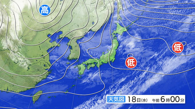 18日午前6時の天気図ですが、西高東低の冬型の気圧配置が続いています。