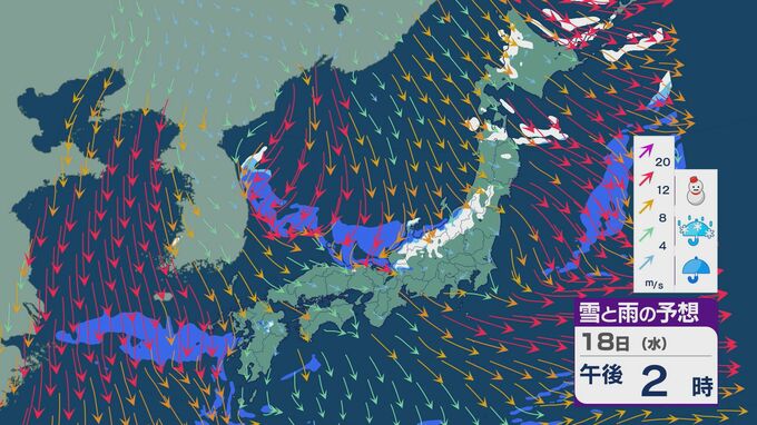 19日にかけての雨や雪、風の予想です。18日の日中は東北の日本海側や北陸の山地を中心に雪が降る見込みです。