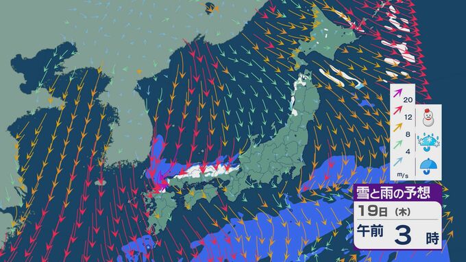 日本海で風が収束し発達した雨雲が西日本に流れ込み、19日にかけては山陰など西日本でも雪が降りそうです。