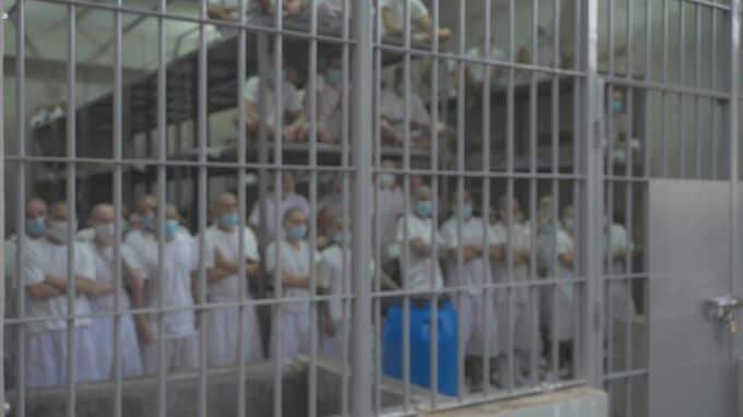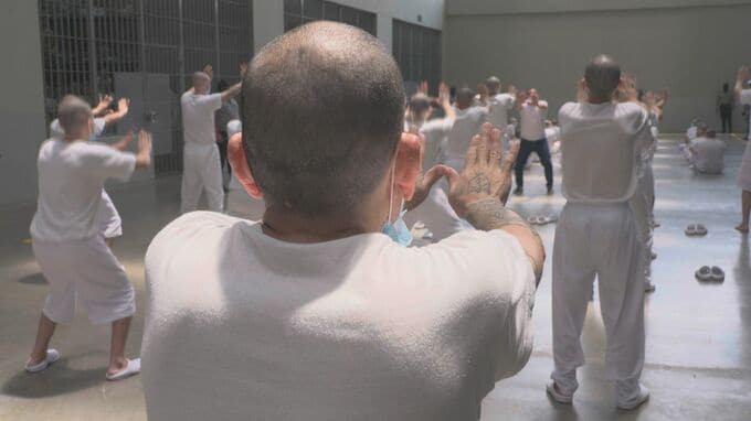それぞれの監房には100人近くの受刑者がいるようだ。全員が同じ白いTシャツを着ていて、髪は丸刈りだ。顔や体にギャングとの関係を示すタトゥーがある。様々な年齢の受刑者がいるが、20代くらいの若い世代が多い。
