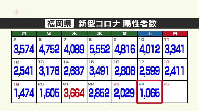 新型コロナウイルスについて、福岡県は新たに1065人の陽性を発表しました。佐賀県では161人が陽性となっています。福岡県の一日ごとの陽性者数を示すカレンダーです。24日は1065人で前の週の同じ…