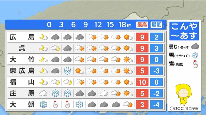 きょう18日(水)の広島県内は、引き続き冬型の気圧配置で寒い一日になりました。特に朝の冷え込みが厳しかった地点が多く、世羅町や東広島では-3.9℃を記録し、今季一番の冷え込みになりました。