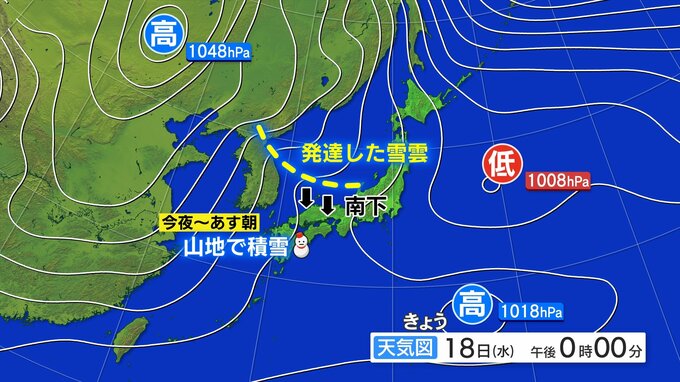 19日(木)朝まで山地を中心にまとまった雪の予想 路面の積雪や凍結に注意
