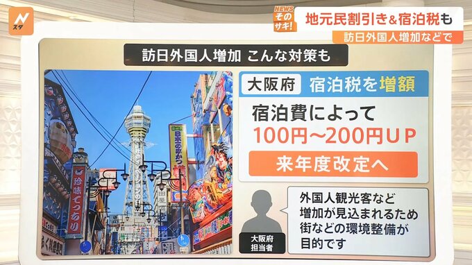 大阪府では、宿泊税を増額する動きがあります。宿泊費によって、100円から200円のアップを想定していて、2025年度に改定へと動き出しています。
