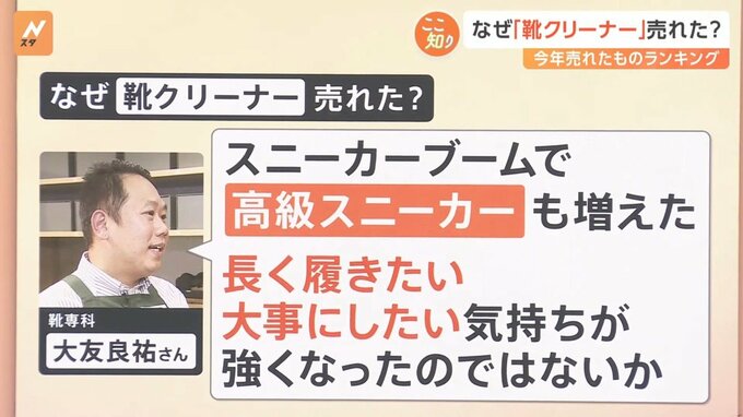 では、なぜ靴クリーナーが売れたのか。靴専科の大友良祐さんは「スニーカーブームで高級スニーカーも増えた。長く履きたい、大事にしたい気持ちが強くなったのではないか」と話しています。