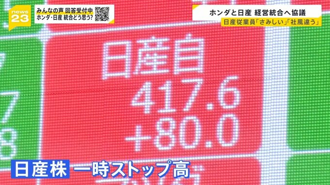 このニュースを受け、日産の株は取引開始直後から、大きく値上がりし、一時ストップ高に。前の日から20%あまり高い417円で取り引きを終えました。