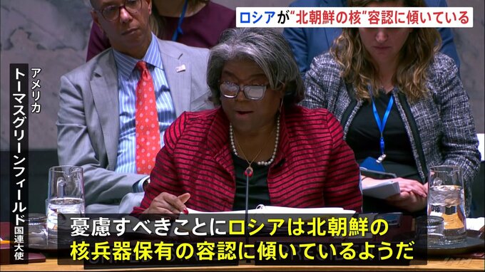 アメリカの国連大使は、安全保障理事会の緊急会合で、ロシアが北朝鮮の核兵器保有を容認する方向に傾いていると懸念を示しました。アメリカ トーマスグリーンフィールド国連大使「憂慮すべきことに、ロシアは北朝…