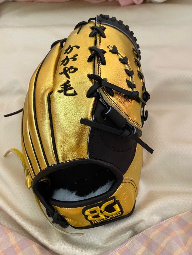 投稿された写真では、ゴールドに輝くグラブに「かがや毛」の文字が見て取れます。