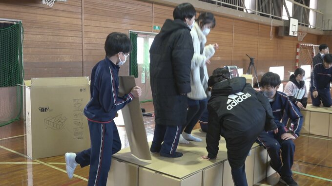 児童らは手軽に手に入り断熱性がある上、6トンの重さに耐えられることを知り、避難生活におけるダンボールの有効活用について学びました。