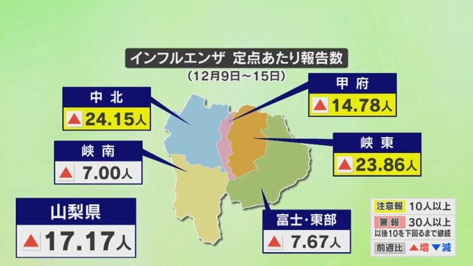 山梨県内でインフルエンザの感染者が前の週の3倍となり、中北に続き、甲府市と峡東が注意報レベルに入りました。