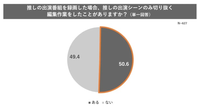 中でも、レコーダーを所持している人に「推しの出演番組を録画した際、推しの出演シーンのみを切り抜く編集作業をしたことがあるか」を聞いたところ、「ある」と回答した人が50.6%となり、2人に1人が録画番組の編集作業を行っていることがわかりました【画像⑪】。