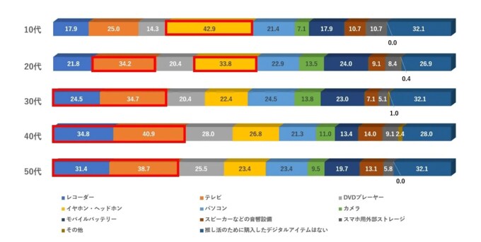 世代別にみると、【画像⑩】のとおり、10代は「イヤホン・ヘッドフォン」が最多という結果から、スマートフォンやPCなどを活用し、出先で推し活の時間を設けていることがうかがえます。