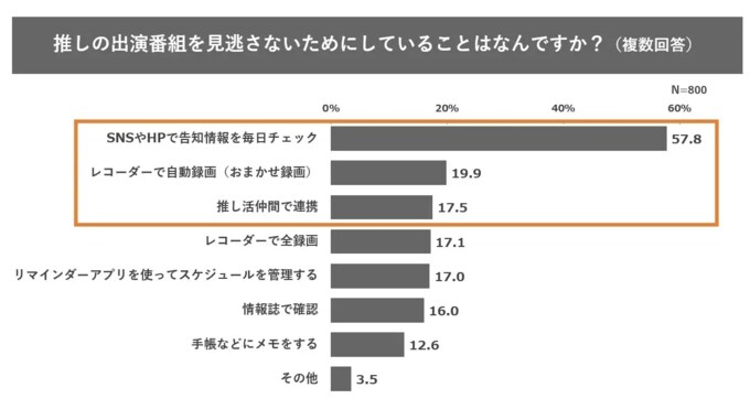 推しを見逃さないためにレコーダーの自動録画機能を使ったデジタルな対策と、SNSやHPの確認や、推し活仲間との連携をするアナログな対策の両方の手段を駆使しているようです【画像⑥】。