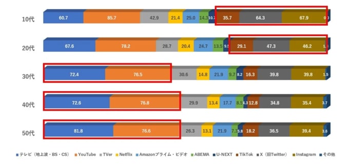 ・30代以降 「YouTube」「テレビ(地上波・BS・CS)」共に7割以上