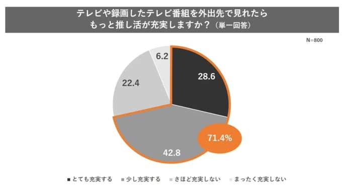 テレビや録画したテレビ番組を外出先で見られたら推し活が充実するかを聞いたところ、「とても充実する」「少し充実する」を合わせると71.4%の人が回答しました。自宅以外でもテレビを見ることができる環境が、推し活をより充実させる鍵となりそうだということです【画像⑭】。